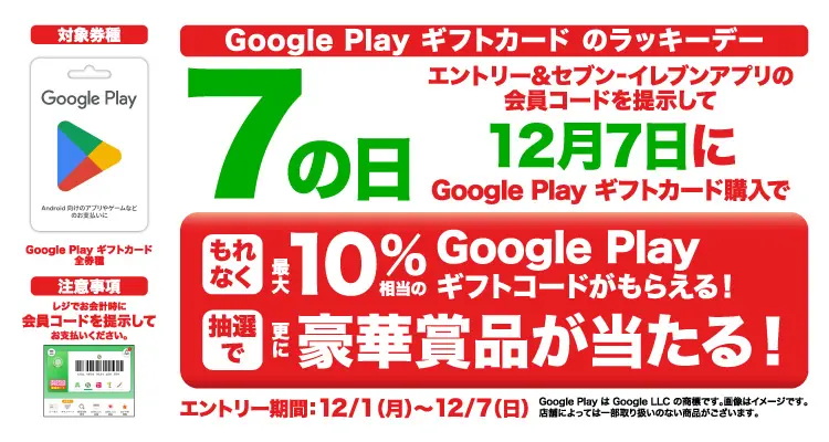 セブン-イレブン限定!Google Play ギフトカード のラッキーデー12月7日(日)、7の日開催!